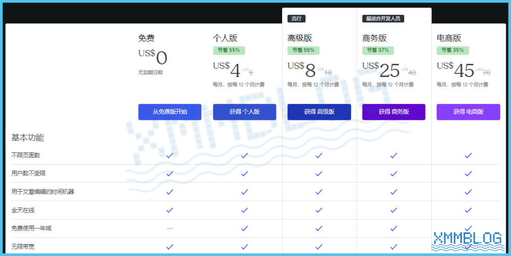| 年付价格 | 0 | $48 | $96 | $300 | $540 |